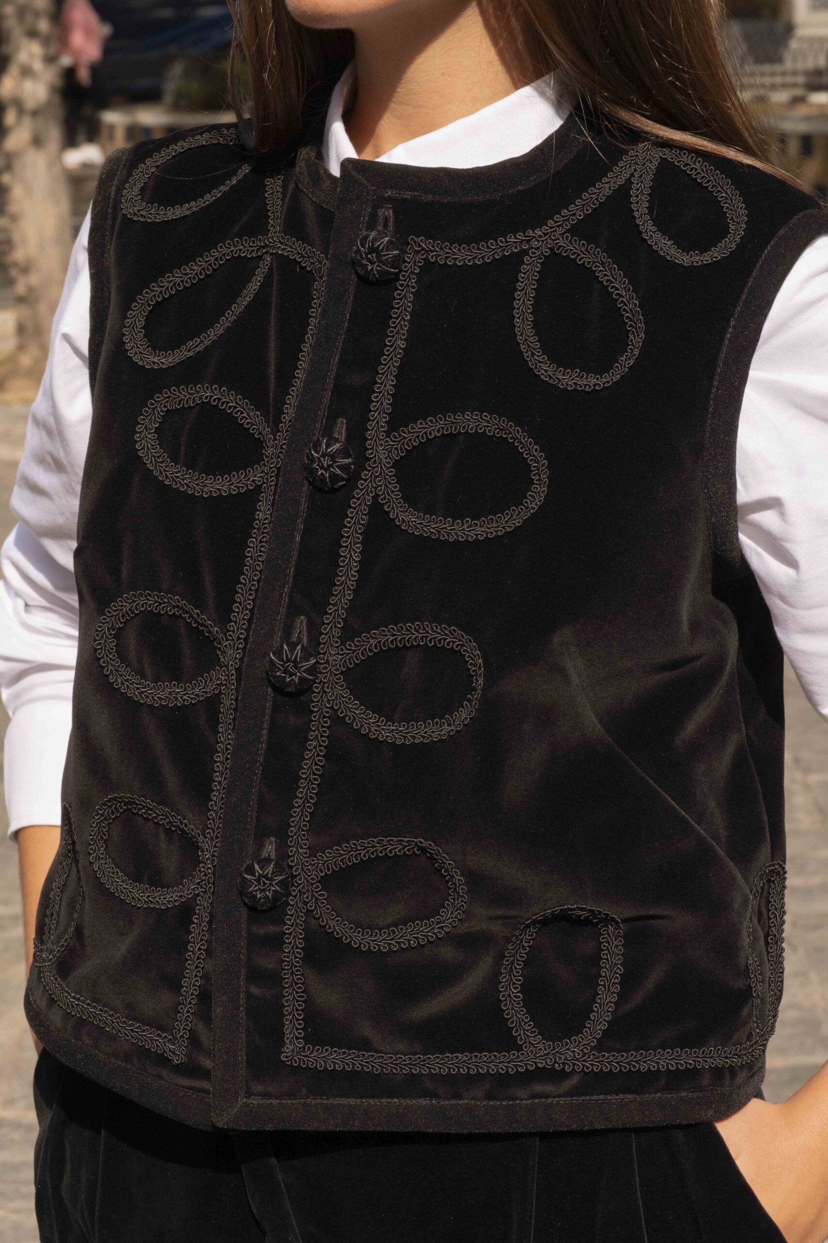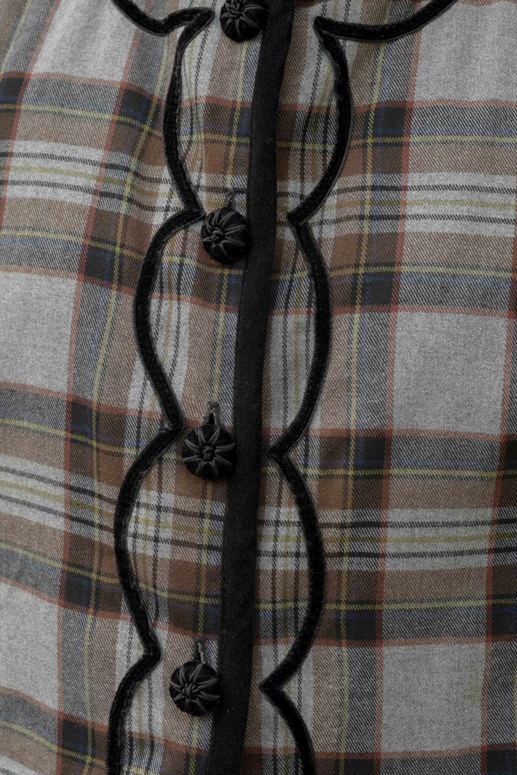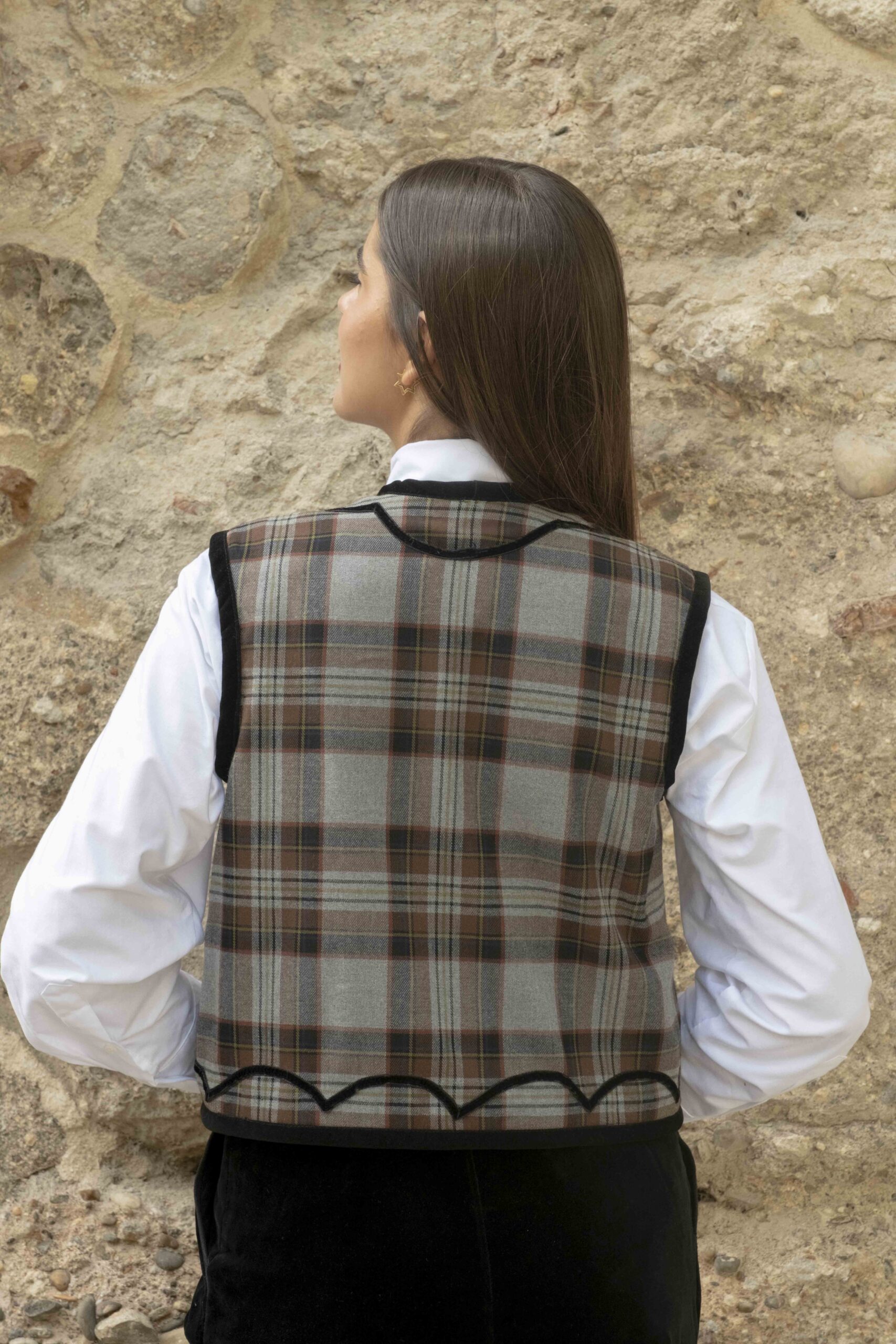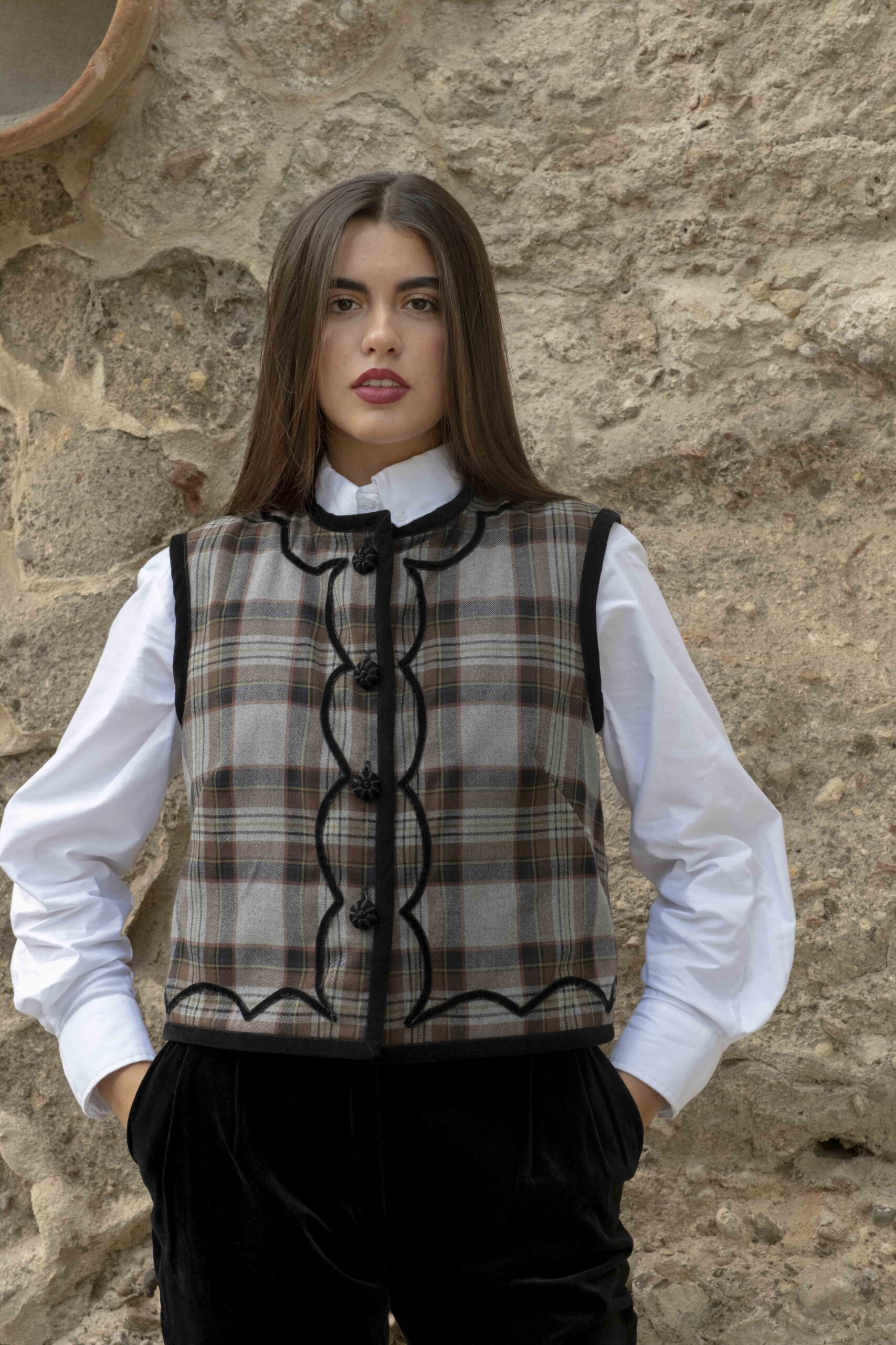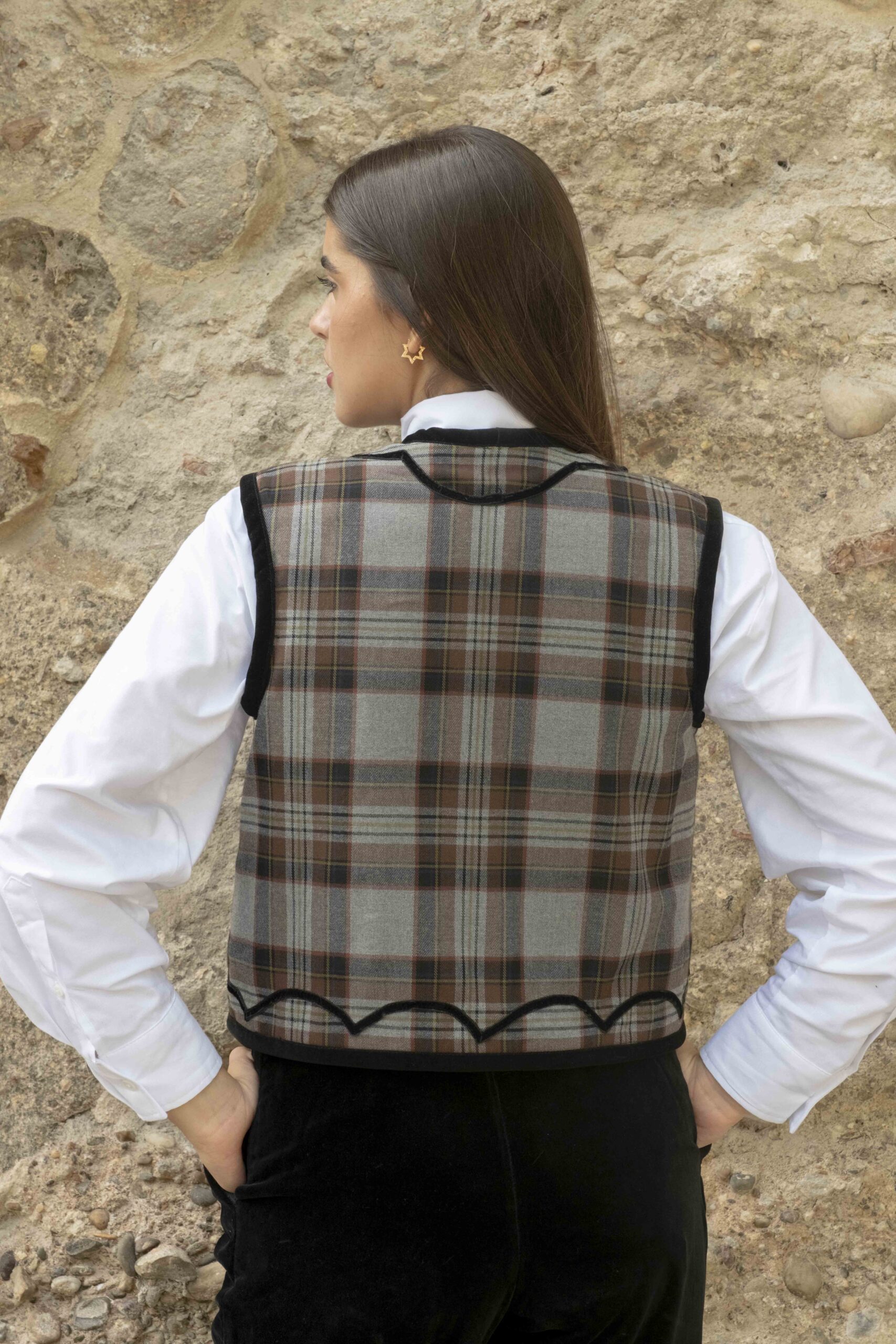 Este chaleco perdurará en tu armario por su calidad y diseño. Por una lado está confeccionado en terciopelo de algodón negro con detalle de pasamanerías y por el otro en cuadros escoceses con terciopelos haciendo ondas. Todo el contorno esta viveado en terciopelo negro y abotonado con botones de pasamanería y terciopelo. Es una prenda muy versátil, válida para cualquier ocasión según por el lado que la uses.  Cómo tomar medidas ⭢