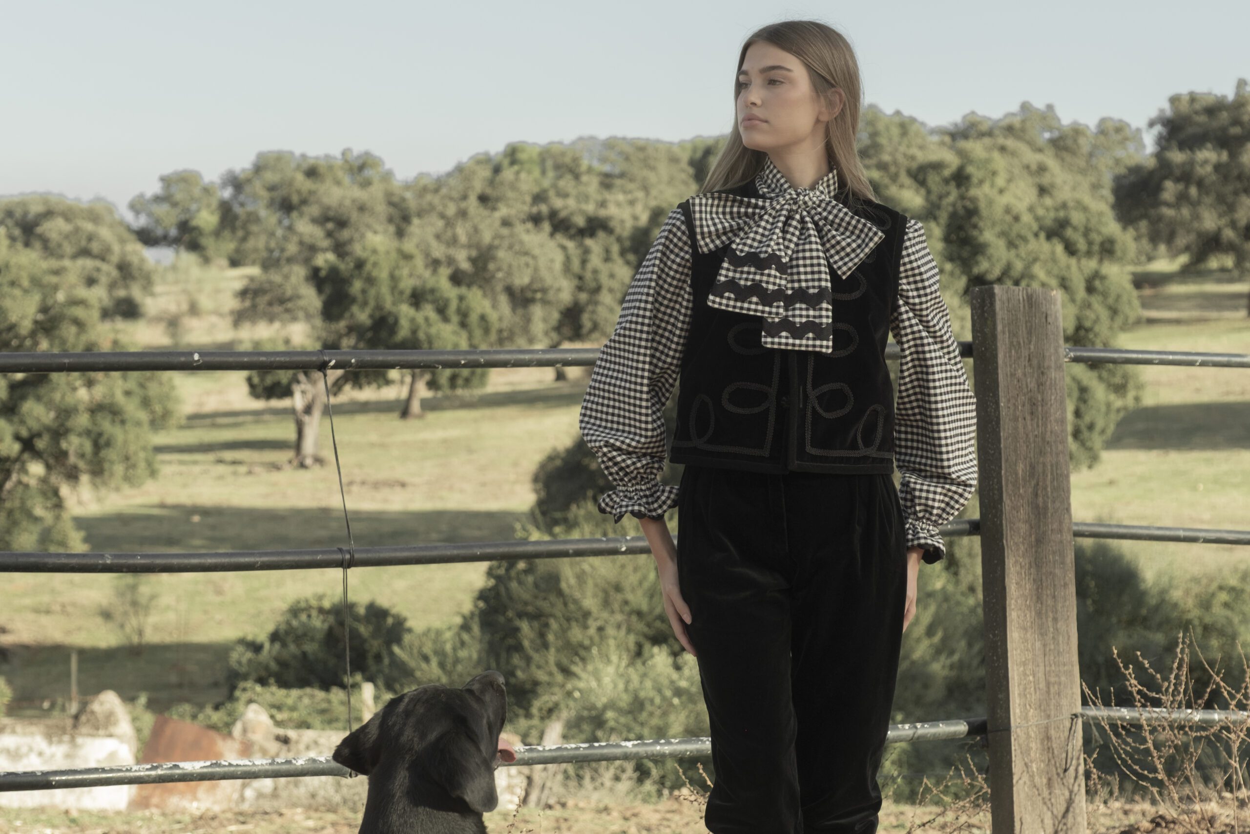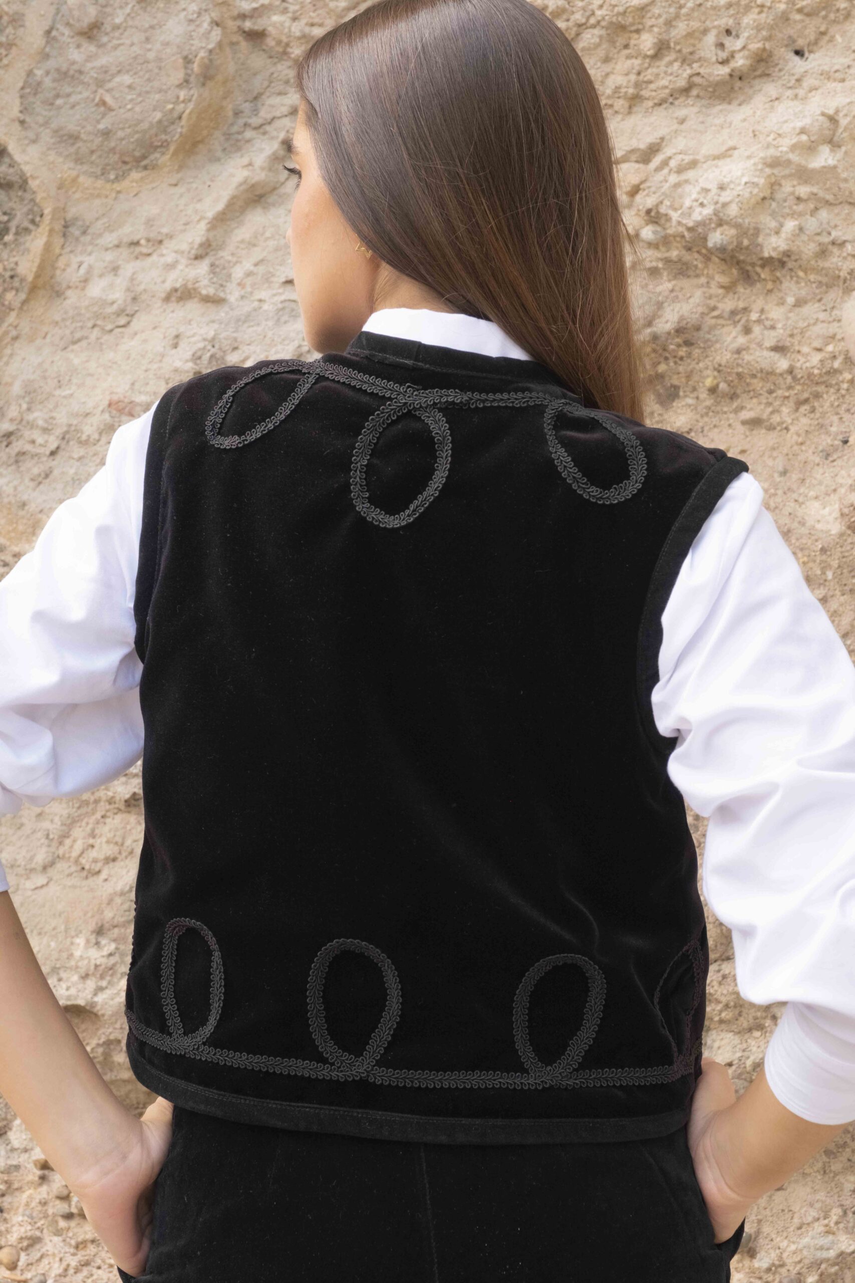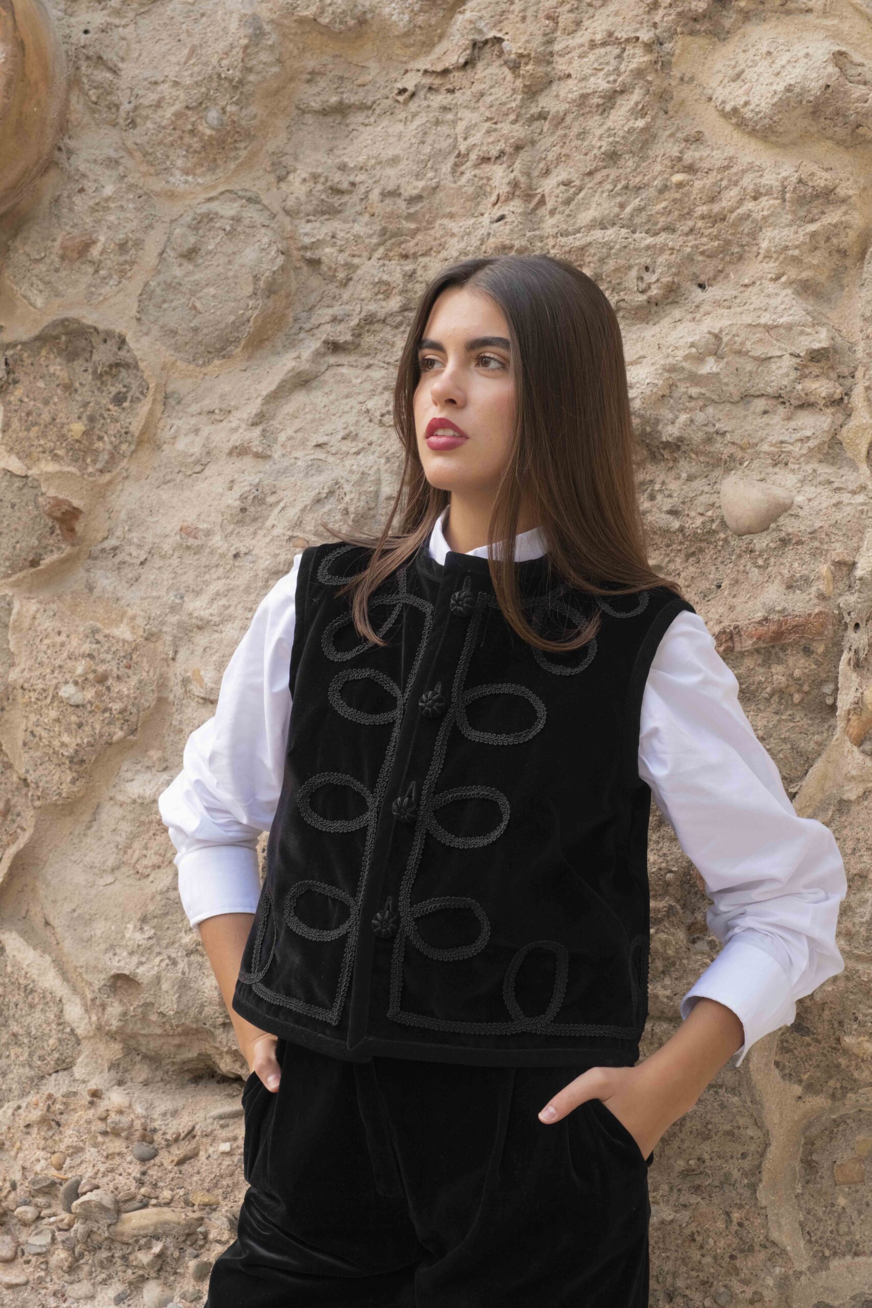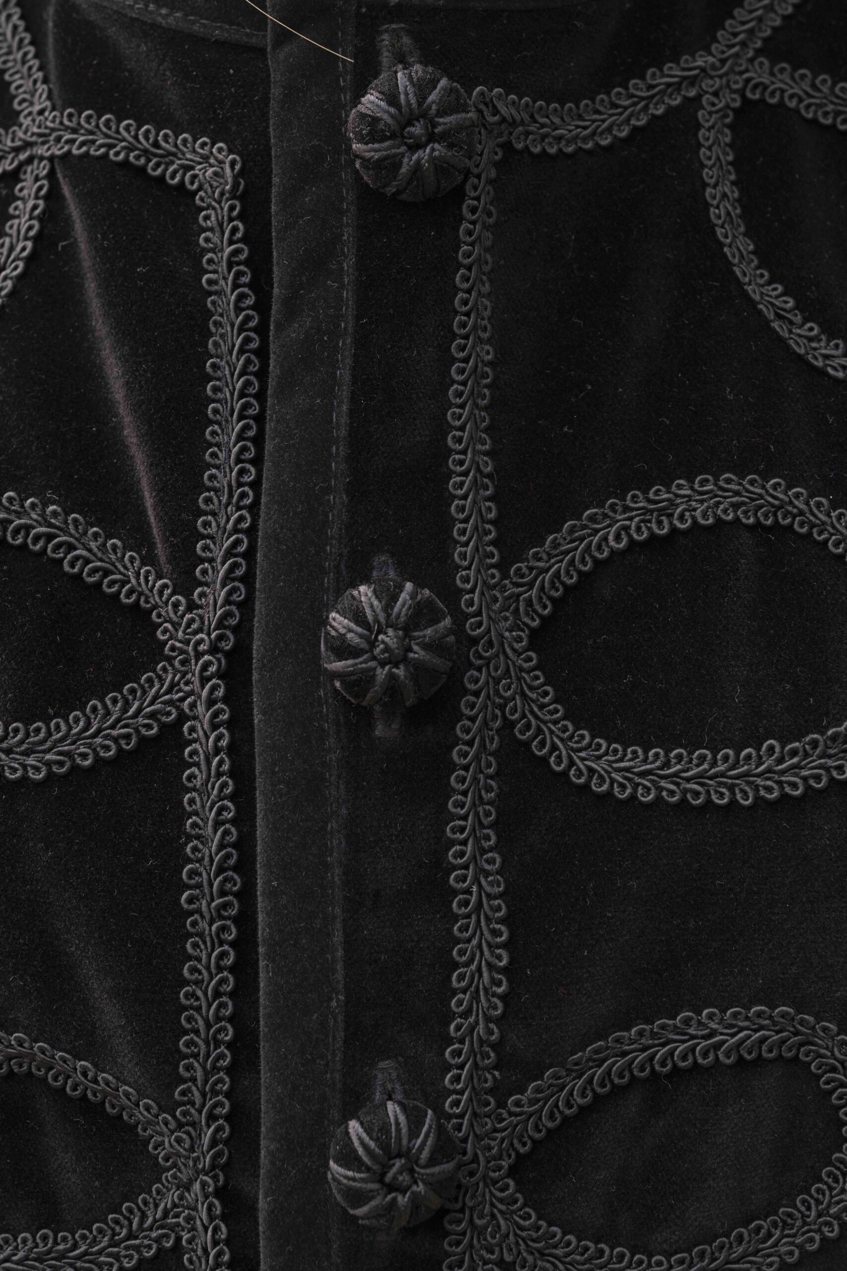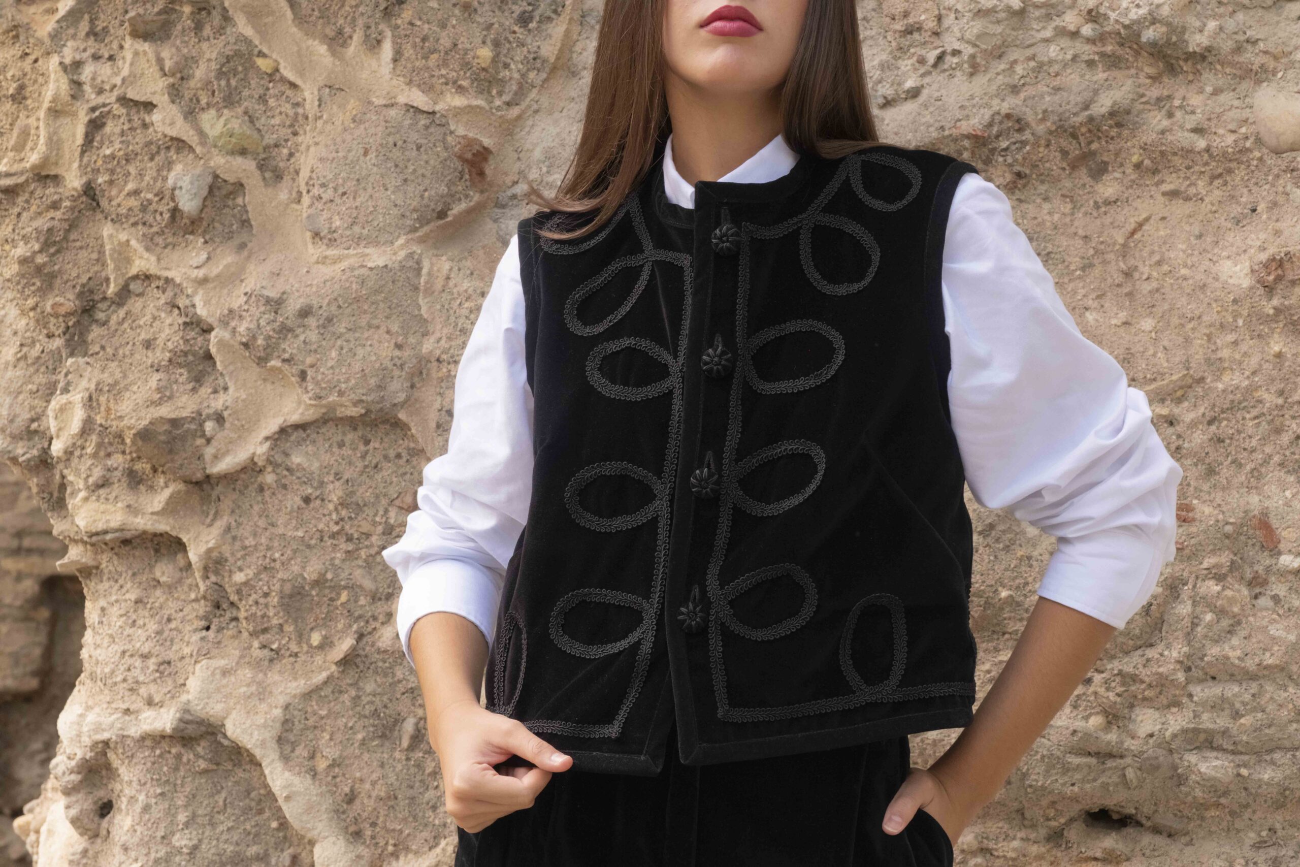 Este chaleco perdurará en tu armario por su calidad y diseño. Por una lado está confeccionado en terciopelo de algodón negro con detalle de pasamanerías y por el otro en cuadros escoceses con terciopelos haciendo ondas. Todo el contorno esta viveado en terciopelo negro y abotonado con botones de pasamanería y terciopelo. Es una prenda muy versátil, válida para cualquier ocasión según por el lado que la uses.  Cómo tomar medidas ⭢