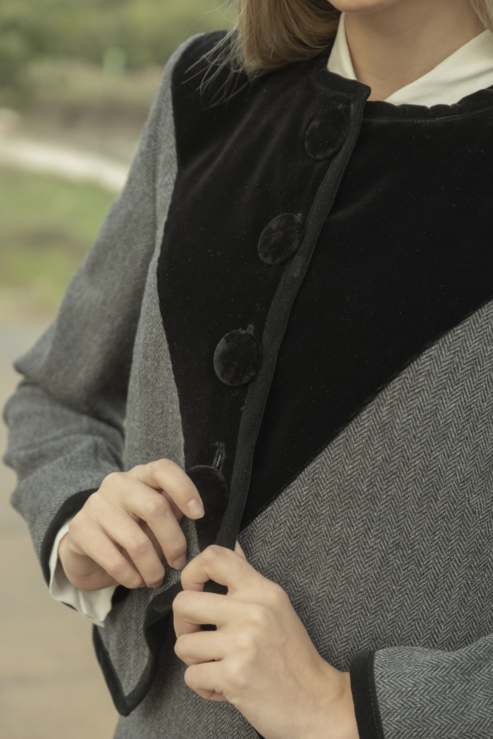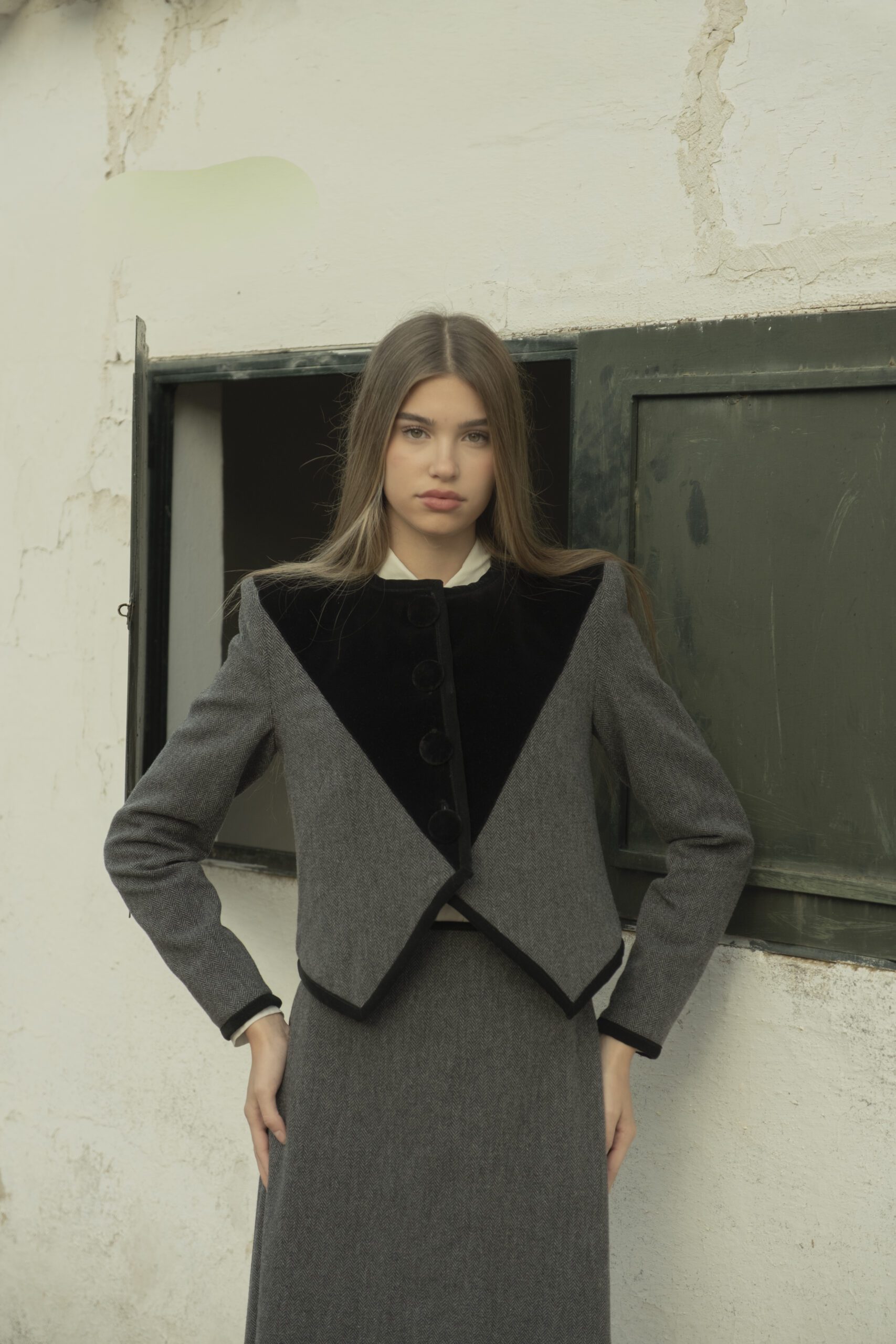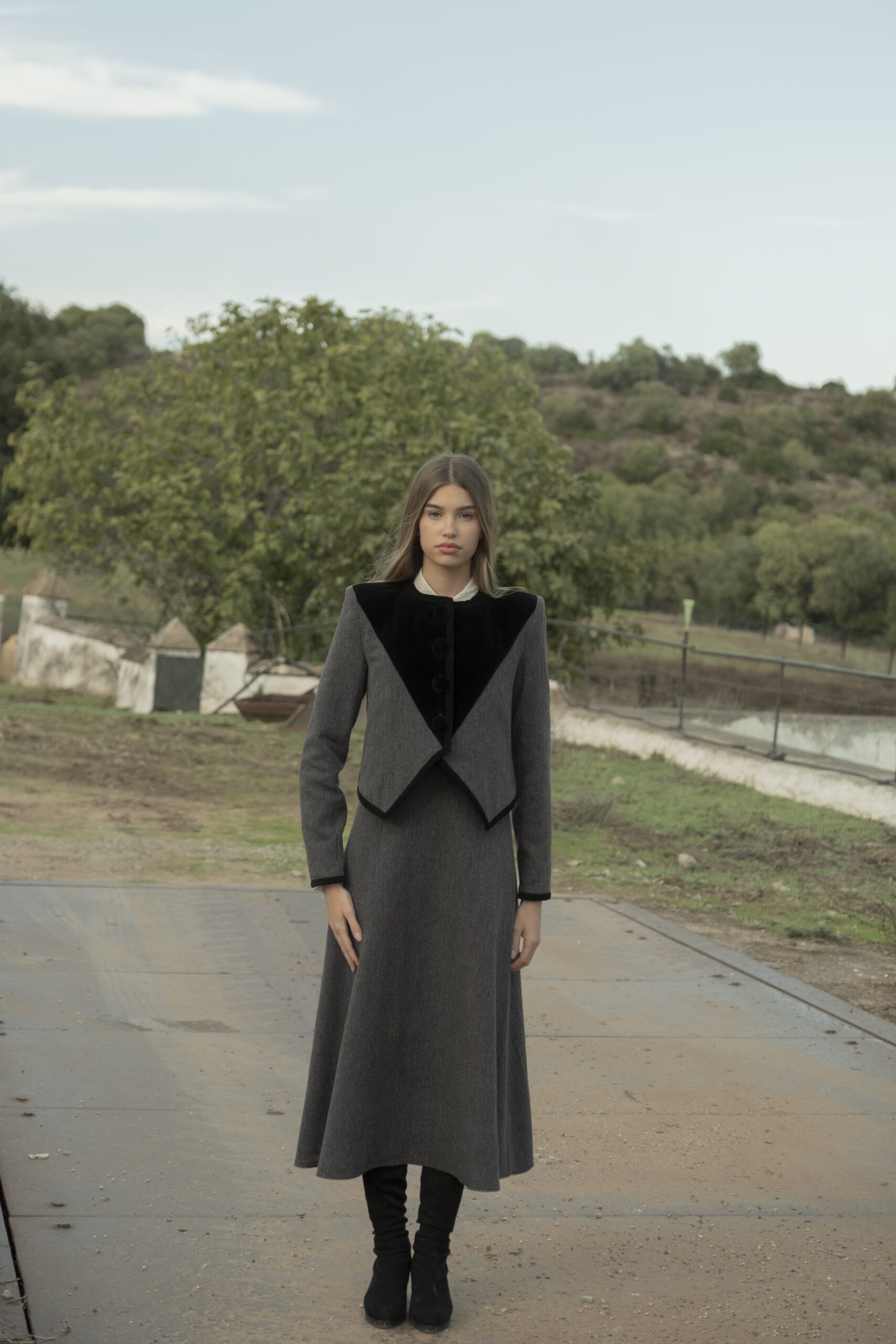 Chaqueta confeccionada con lana virgen de espigas y pico central de terciopelo de algodón, forro enguatado, hombros muy marcados con hombreras pagoda. Viveado y botonadura XL de terciopelo negro.  Cómo tomar medidas ⭢