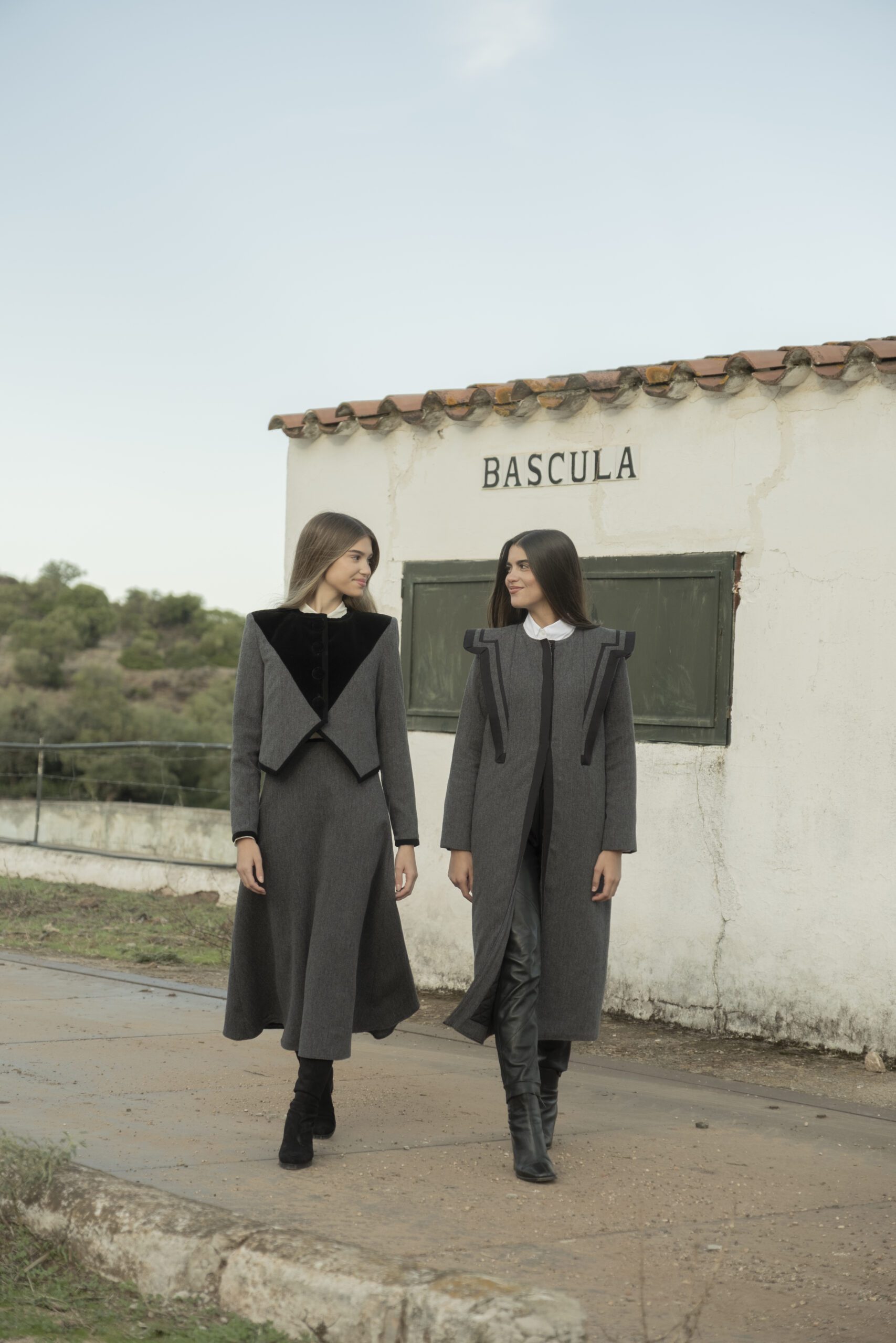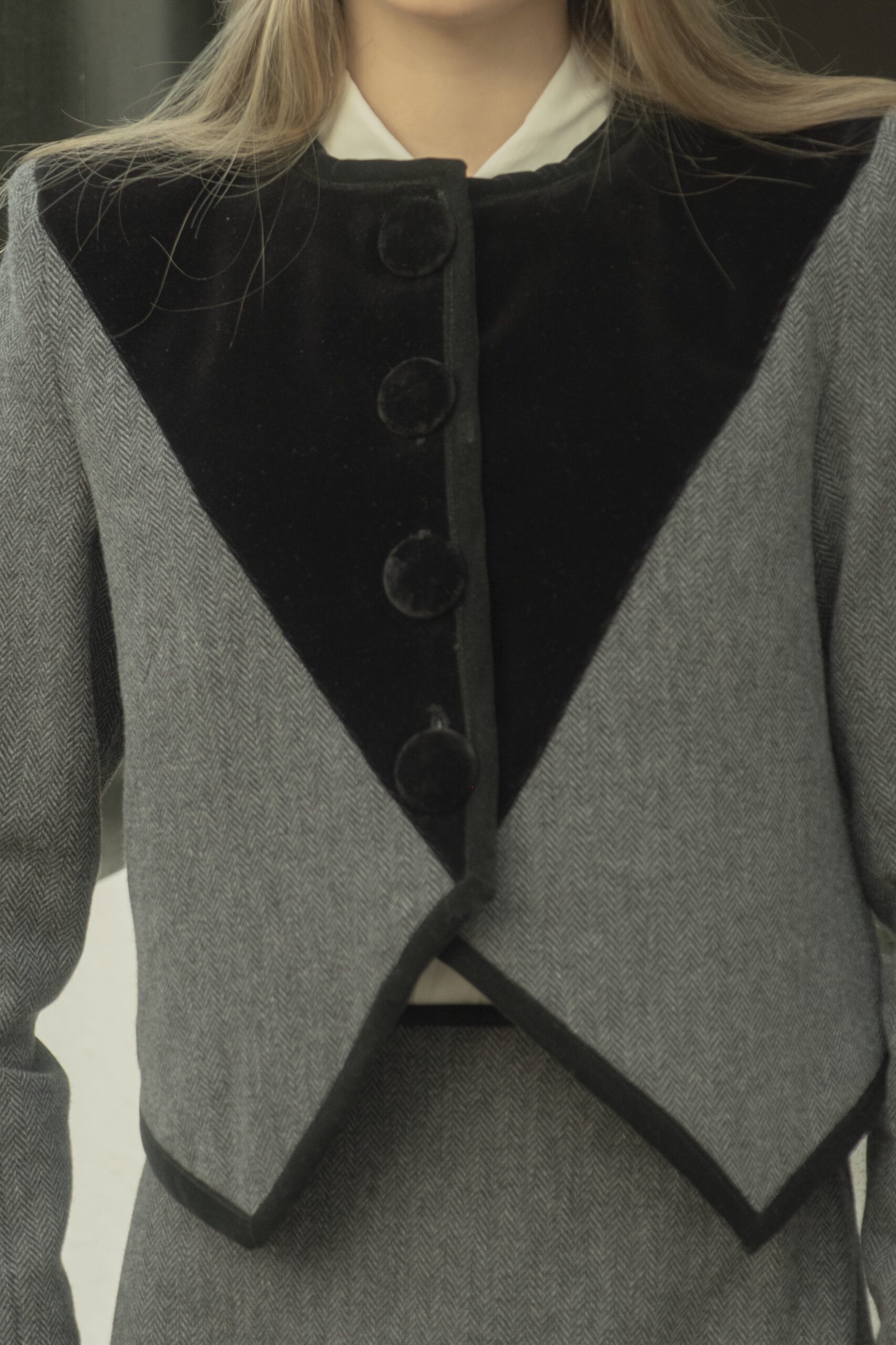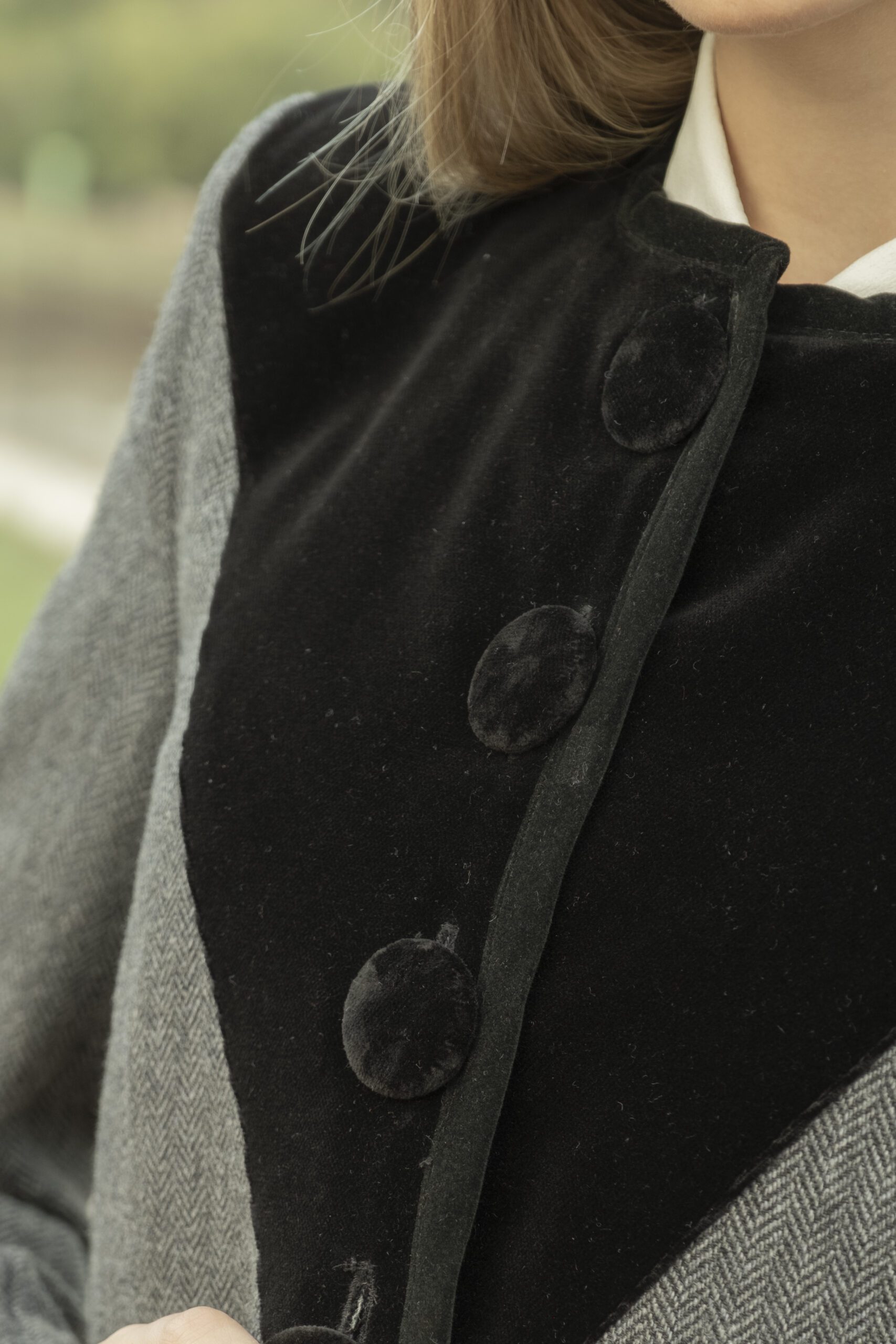 Chaqueta confeccionada con lana virgen de espigas y pico central de terciopelo de algodón, forro enguatado, hombros muy marcados con hombreras pagoda. Viveado y botonadura XL de terciopelo negro.  Cómo tomar medidas ⭢