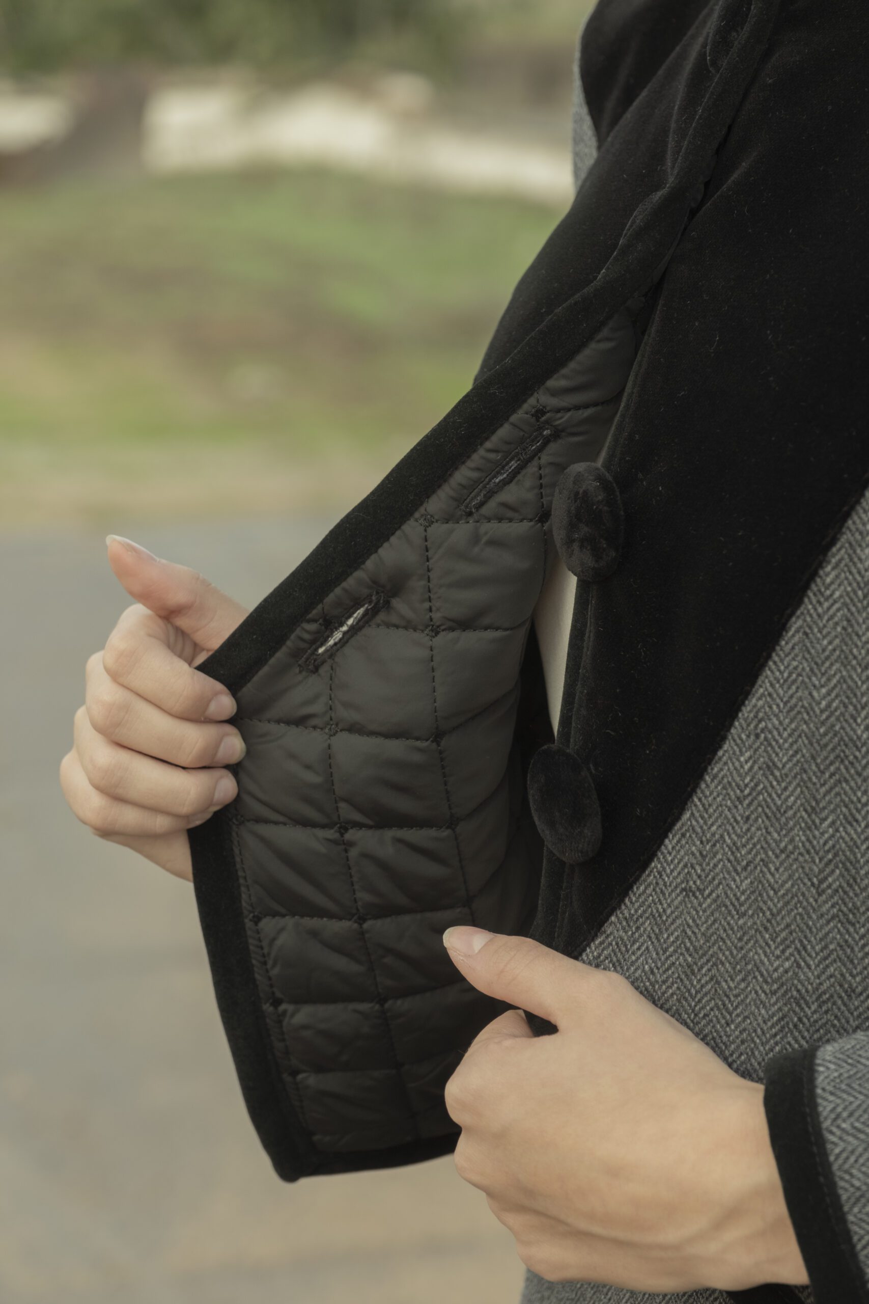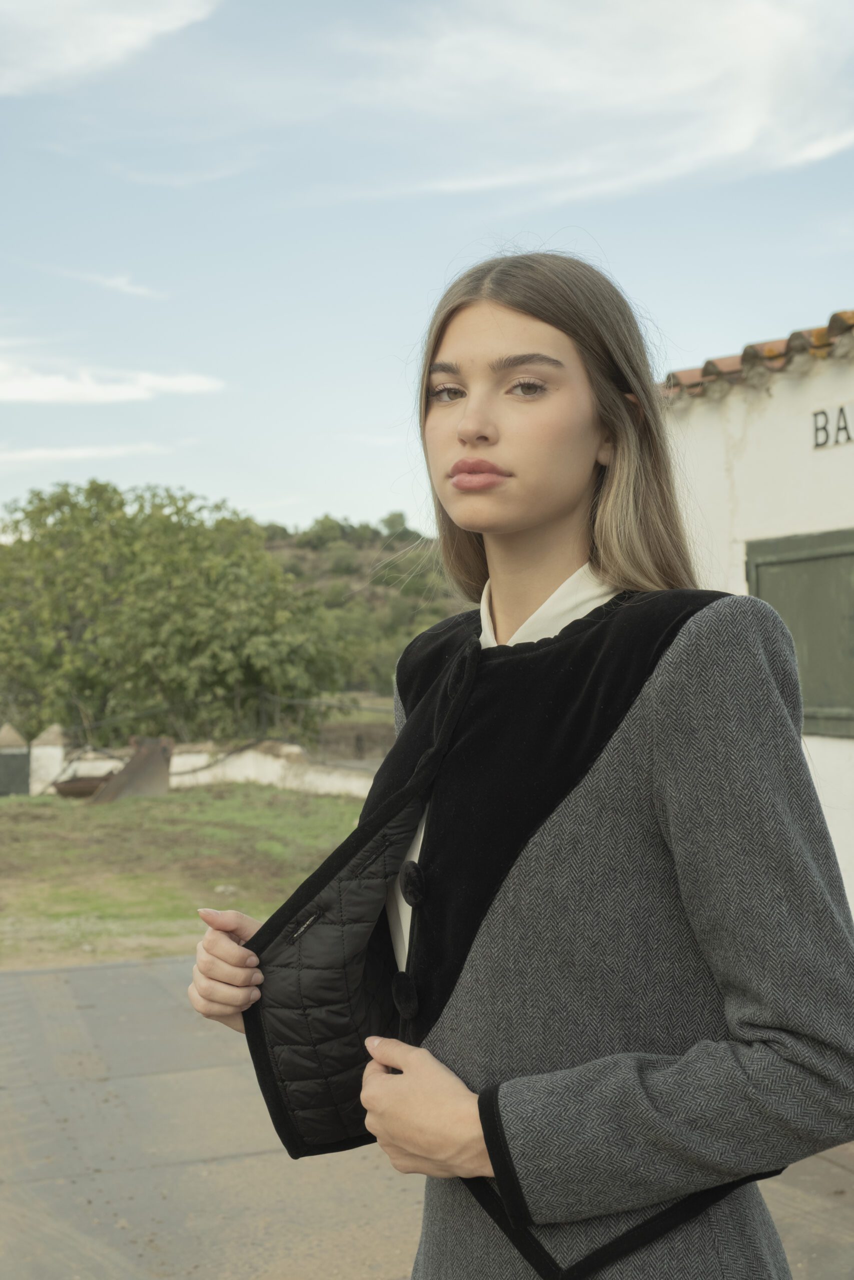 Chaqueta enguatada con exterior de lana en espigas y terciopelo. Siluetas recomendadas ⭢